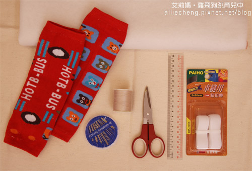 襪套、鋪棉(不織布)、針線、魔鬼氈、剪刀、尺