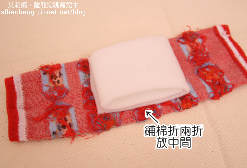 將鋪棉折兩折,放在襪套中間翻回正面