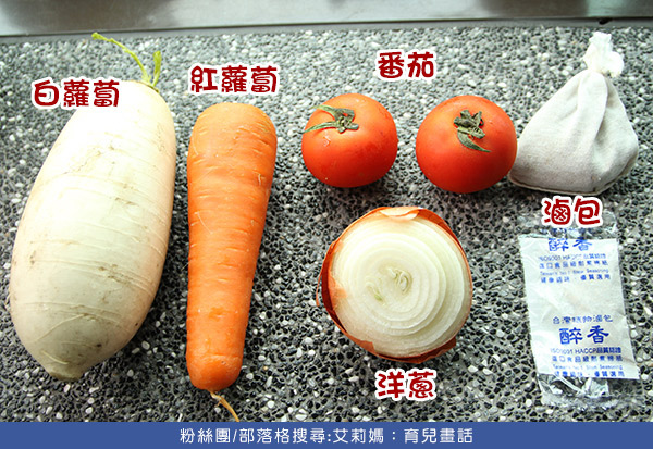 白蘿蔔、紅蘿蔔、番茄、洋蔥、蔥、滷包(買牛肉應該都會送,不然雜貨店或是超市也都買的到)