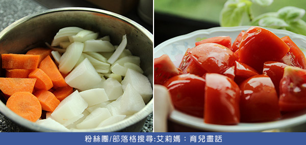 看鍋內的番茄有軟爛後倒入白/紅蘿蔔