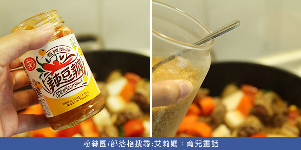 接著加入豆瓣醬(2小匙)、砂糖(1小匙)、米酒(半碗)、醬油(半碗)